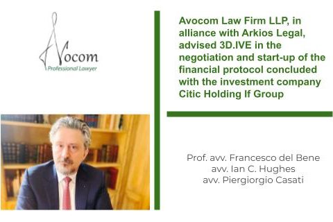Avocom – Associated Professional Studies, now in association with Arkios Legal, with senior partner Francesco del Bene assisted 3D.IVE, an innovative tech start-up creator and developer of “reconstruction” devices in the air using threedimensional components of images and videos, in the negotiation and start-up of the financial protocol concluded with the investment company Citic Holding…